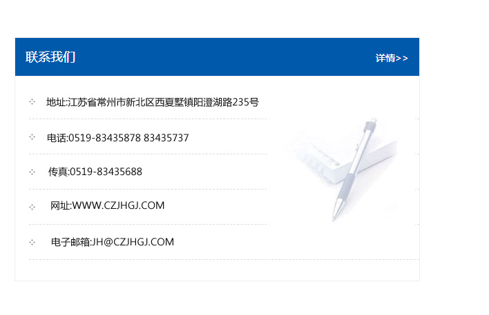 傳真:0519-83435688    郵編:213135    網(wǎng)址:WWW.czjhgj_com.lhxyfdc.com    電子郵箱:JH@czjhgj_com.lhxyfdc.com